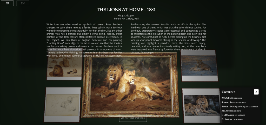 L’exposition a été structurée en quatre salles, pensées comme un parcours progressif. L’entrée dans l’expérience se fait par la reconstitution en 3D de l’atelier de Rosa Bonheur, que nous avons visité afin d’en proposer une reproduction fidèle. Cette première salle a été conçue comme un espace d’introduction, permettant aux visiteurs de mieux connaître l’artiste avant de découvrir ses œuvres.