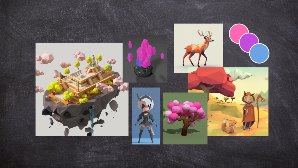 Une fois l’univers posé à l’aide d’un moodboard, j’ai pris en charge la création des éléments visuels du jeu sur Blender. J’ai conçu de toutes pièces plusieurs éléments de décor, comme des arbres, des lanternes, des pierres, des fleurs ou encore le portail d’arrivée du personnage, afin de donner une identité visuelle cohérente et immersive au monde du jeu.